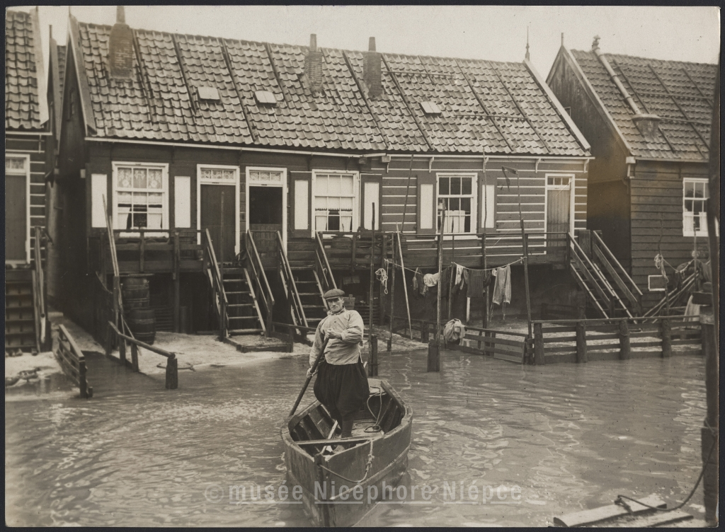Une rue de l'Ile de Marken / inondée , on ne peut circuler / entre les diverses maisons / qu'en bateau