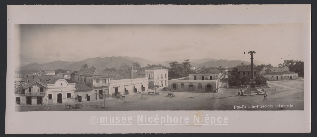 vue d'architecture - personnage - place - maison - entrepôt - charrette - ? - montagne - colonne commémorative - Puerto Cabello - CHUSSEAU-FLAVIENS - AVRIL H.
