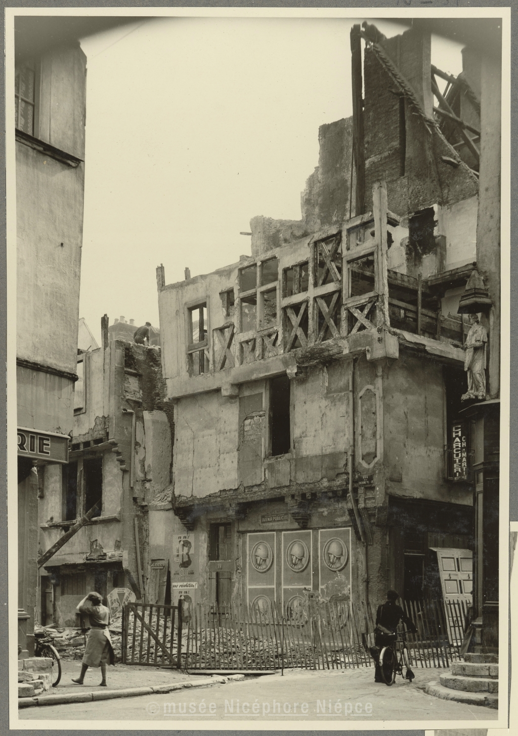 Démolition d'une vieille maison du XVIè siècle, menaçant ruine, au carrefour des rues St Vincent et des Cochons de Lait 20 Avril 1953