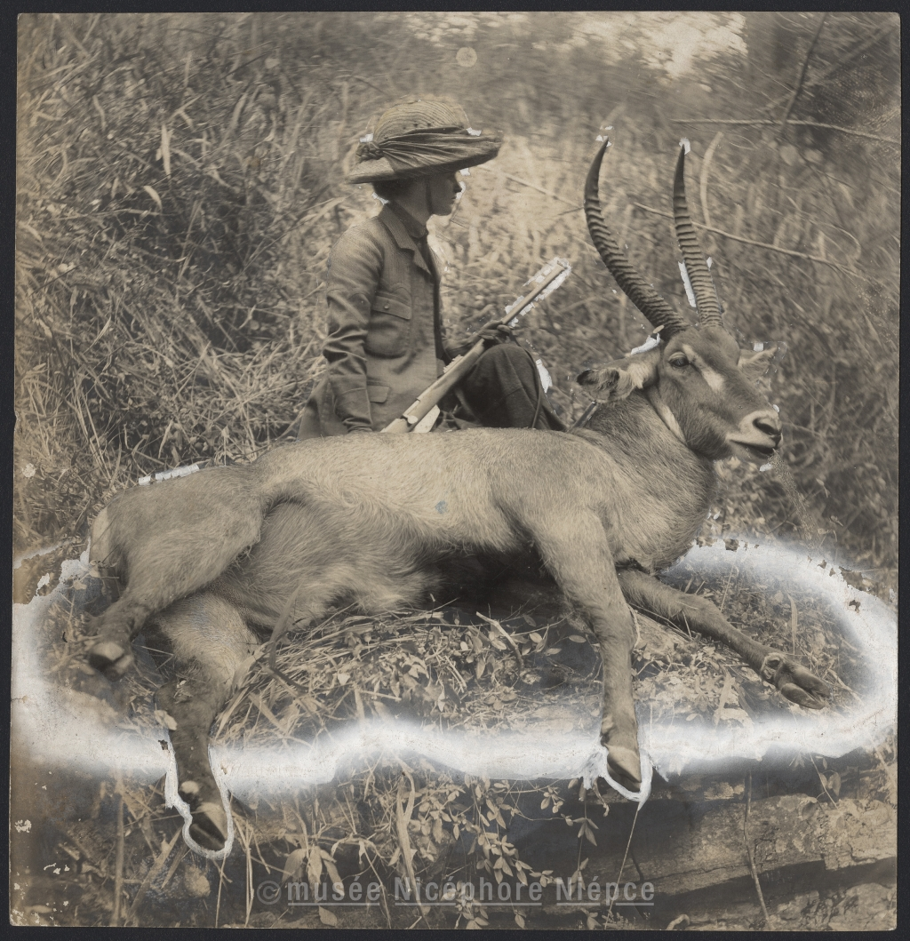Jeune femme fusil à la main, posant au pied d'une antilope