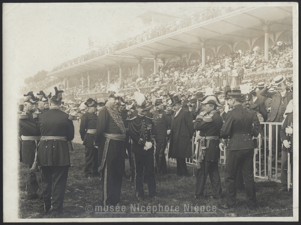 Personnalités politiques et foule dans les tribunes d'un champ de courses lors d'une d'une visite officielle