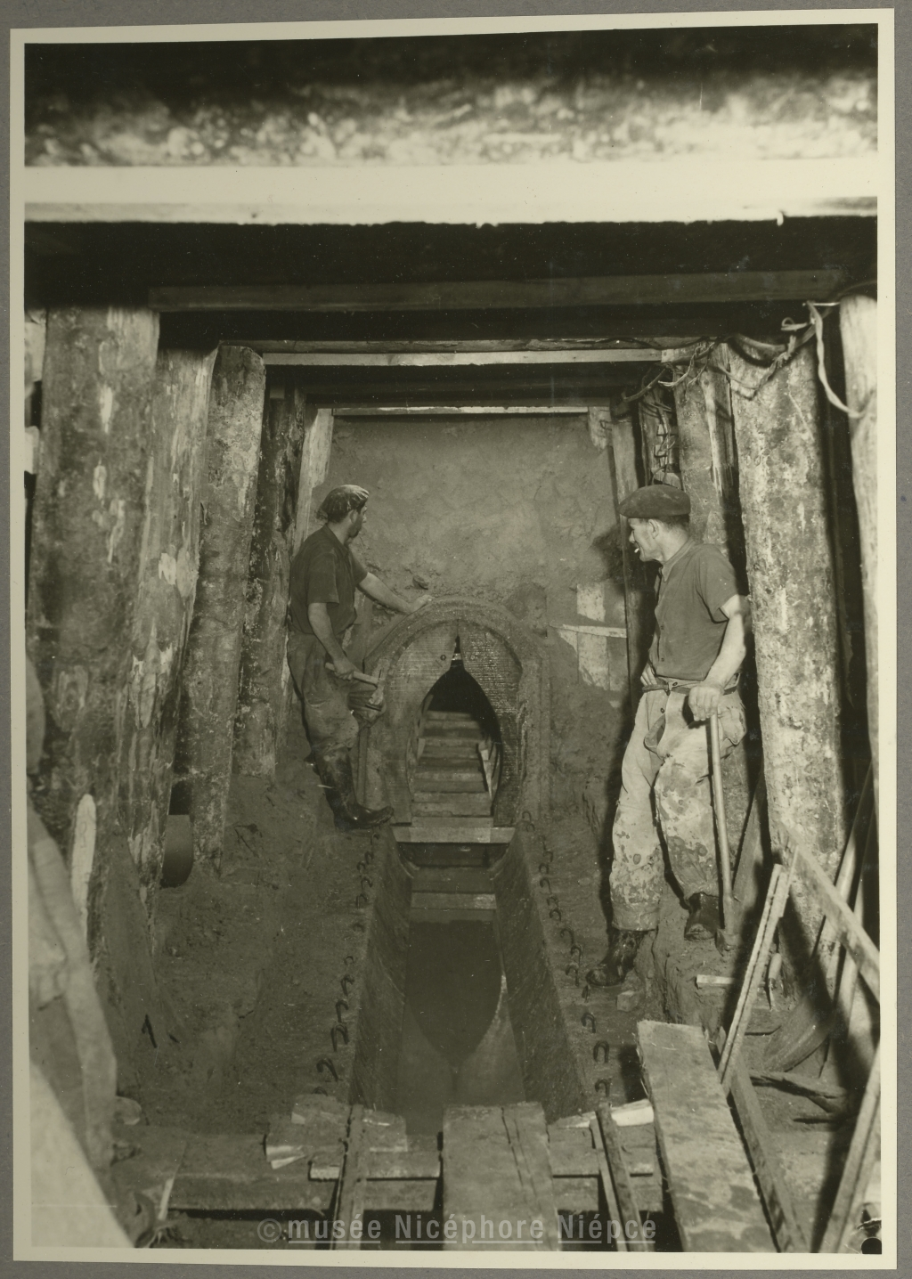 Construction de l'égout, en tunnel, sous la propriété Neyrat, et son débouché dans le Canal du centre 13 Avril 1954