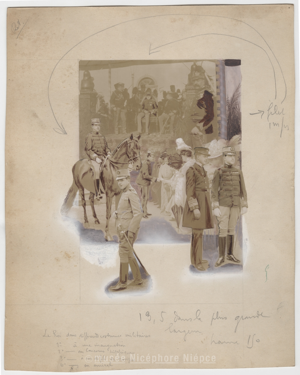 Le Roi dans différents costumes militaires / 1° à une inauguration / 2° au Concours hippique / 3° à un défilé de troupes / 4° en amiral