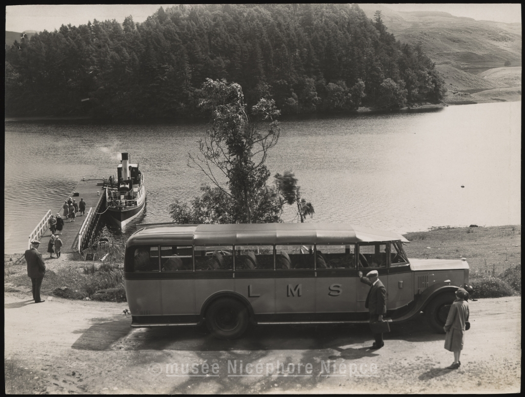 Bus de touristes au bord d'un lac en Ecosse