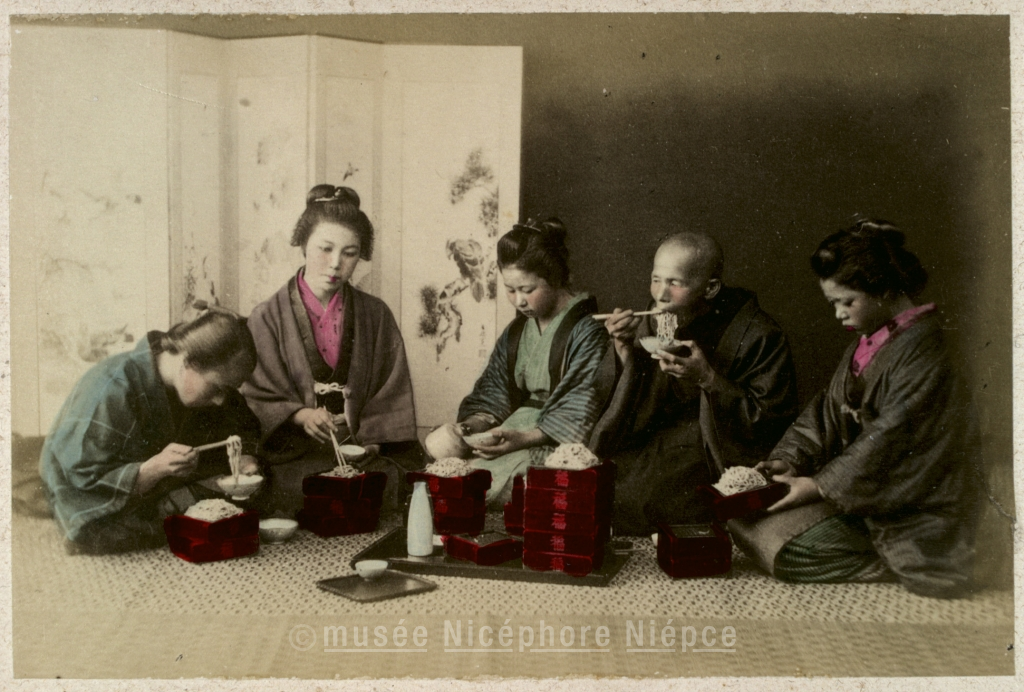 Quatre femmes japonaises et un vieillard prenant leur repas