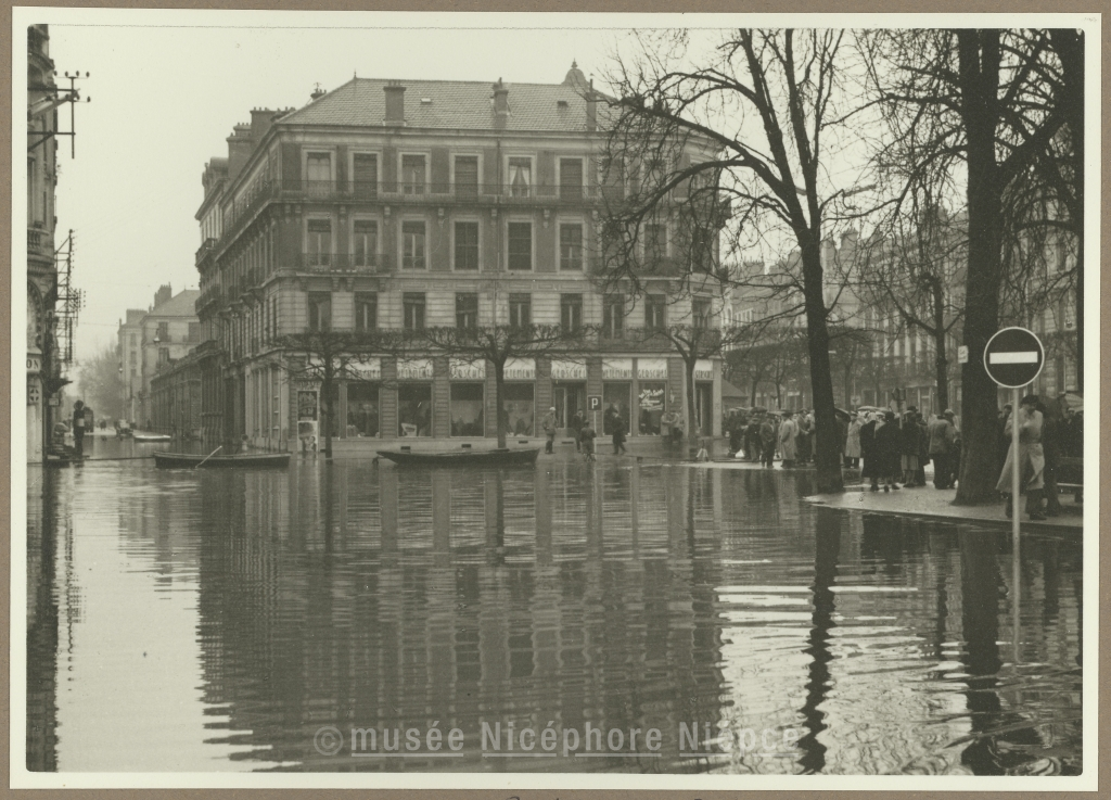 Inondations de Janvier 1955 Rue de la Banque. PLace de l'Obélisque. Bd de la République