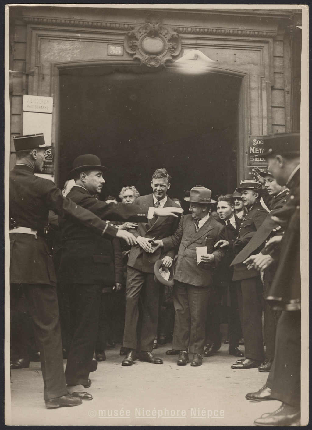 L'aviateur Lindbergh photographié / à sa sortie de chez Madame Nungesser
