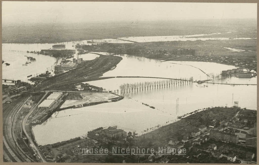 Inondations de Janvier 1955 Au 1er plan, le quartier de Bellevue, puis la route submergée et la voie ferrée de Givry, ensuite, Californie, St Rémy, la Corne