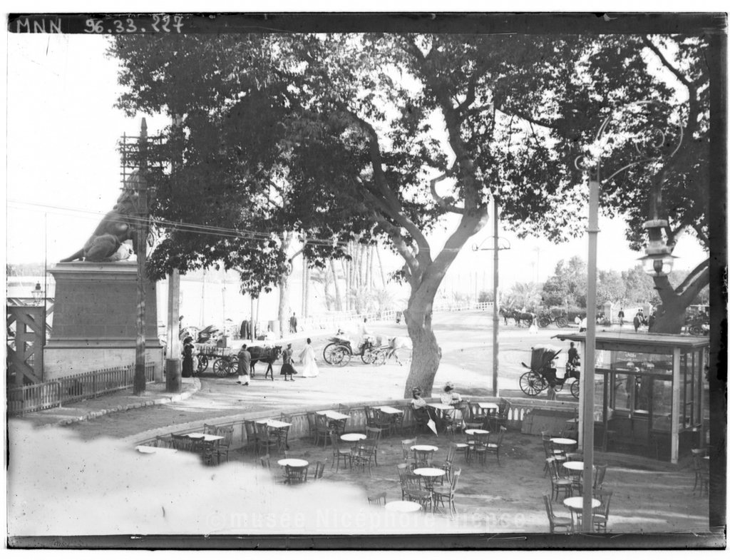 Le Caire, café du pont de Kars el Nil et tramway des pyramides