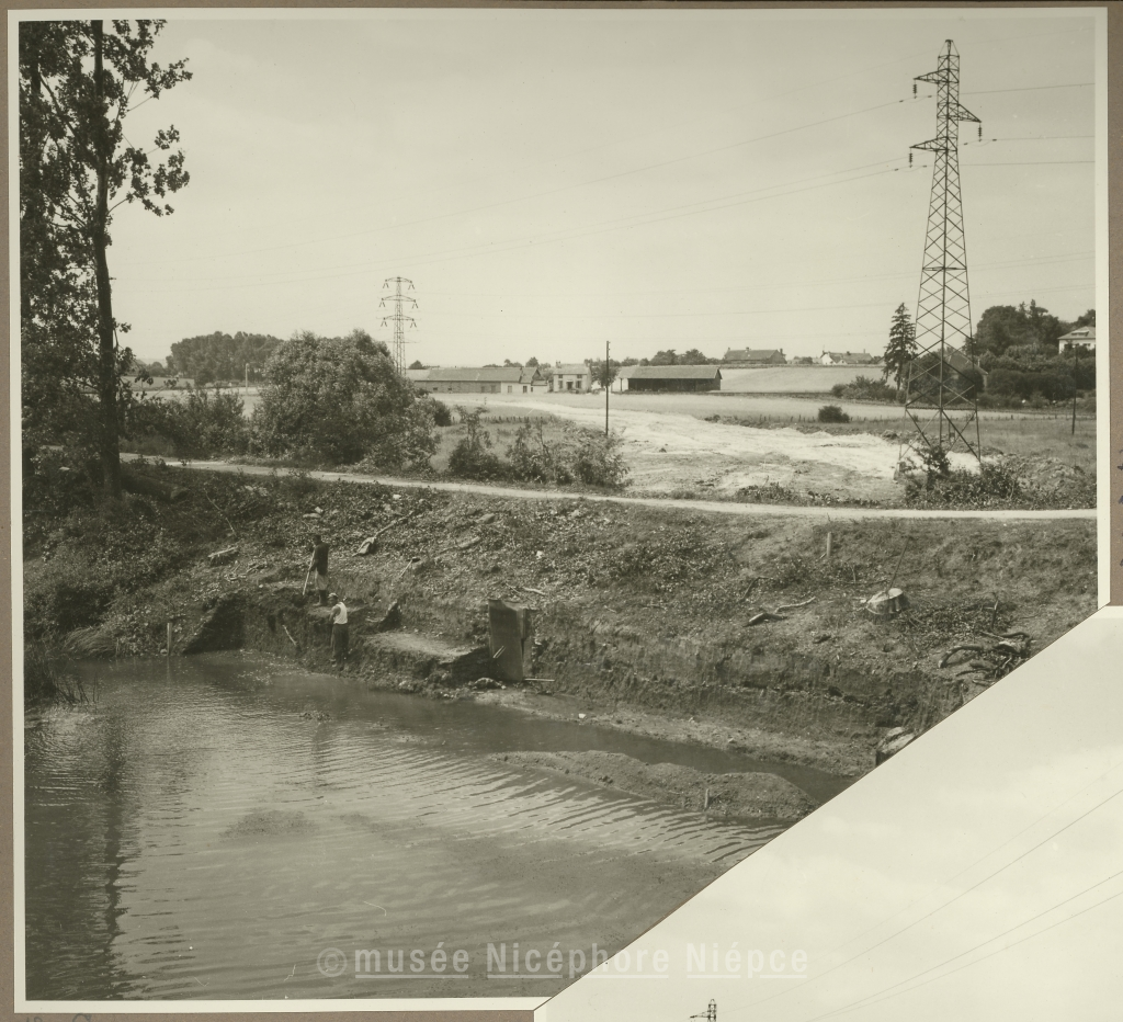 Raccordement de la déviation, au Sud de Chalon, avec la route Nle 6 actuelle à hauteur de la rivière la Corne, qui sera franchie par un nouveau pont, dont les fouilles des culées sont commencées 25 Juillet 1956