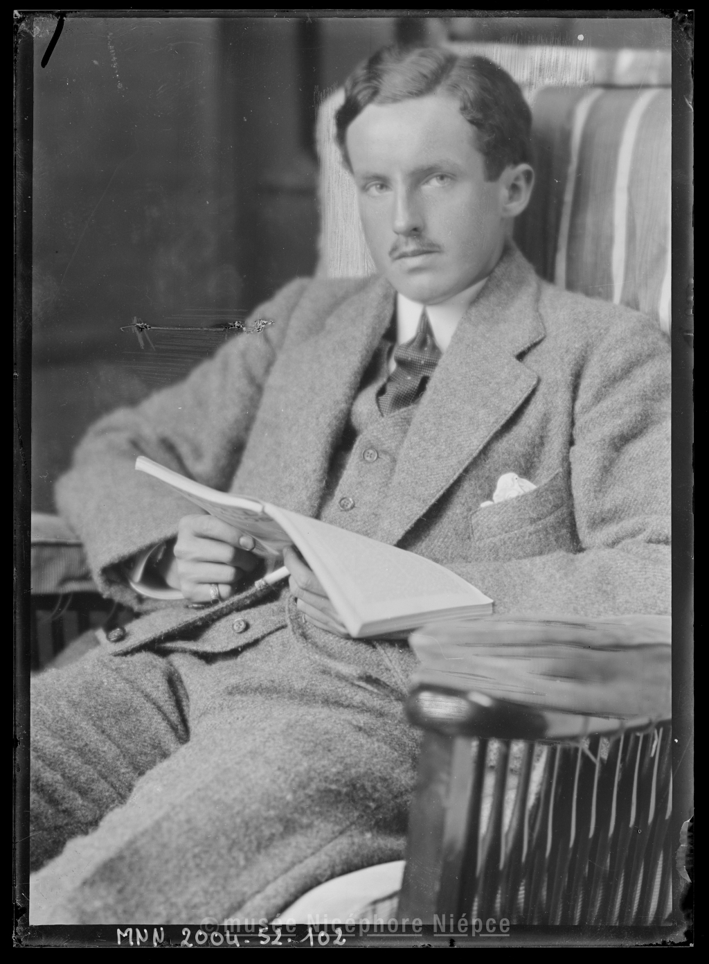 Bob assis, en costume chiné, tenant un livre
