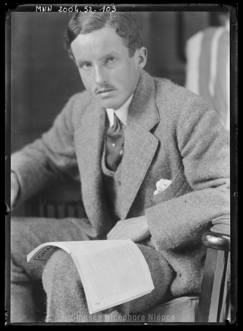 Bob assis, en costume chiné, tenant un livre