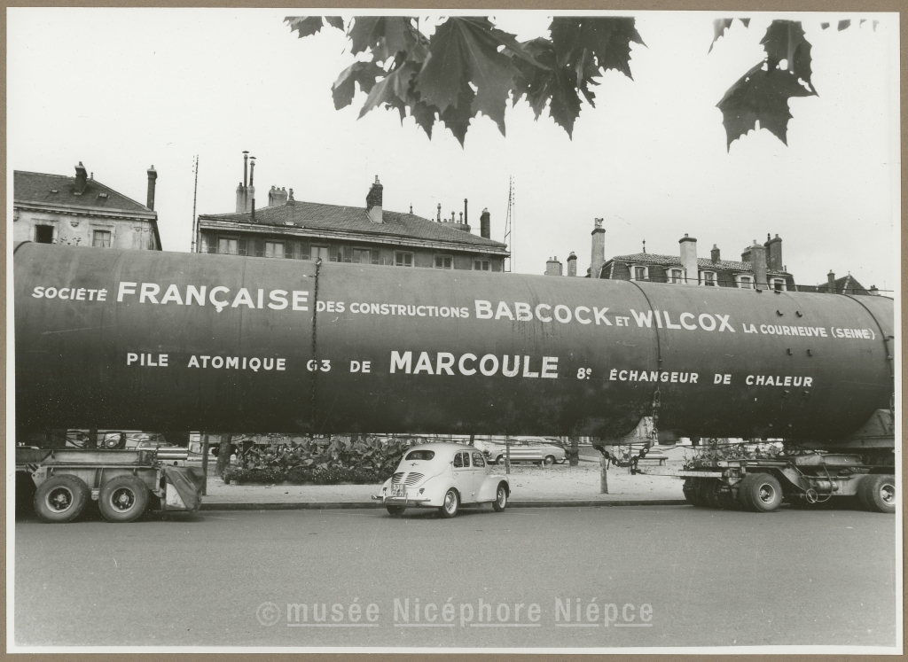 Le lundi 21 octobre 1957, passage à Chalon, du 8ème et dernier convoi d'un échangeur de chaleur pour l'usine atomique de Marcoule