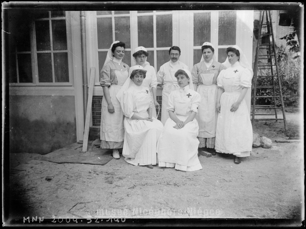 Portrait de groupe du personnel du dispensaire dont Germaine Demachy (?) au premier rang à gauche.