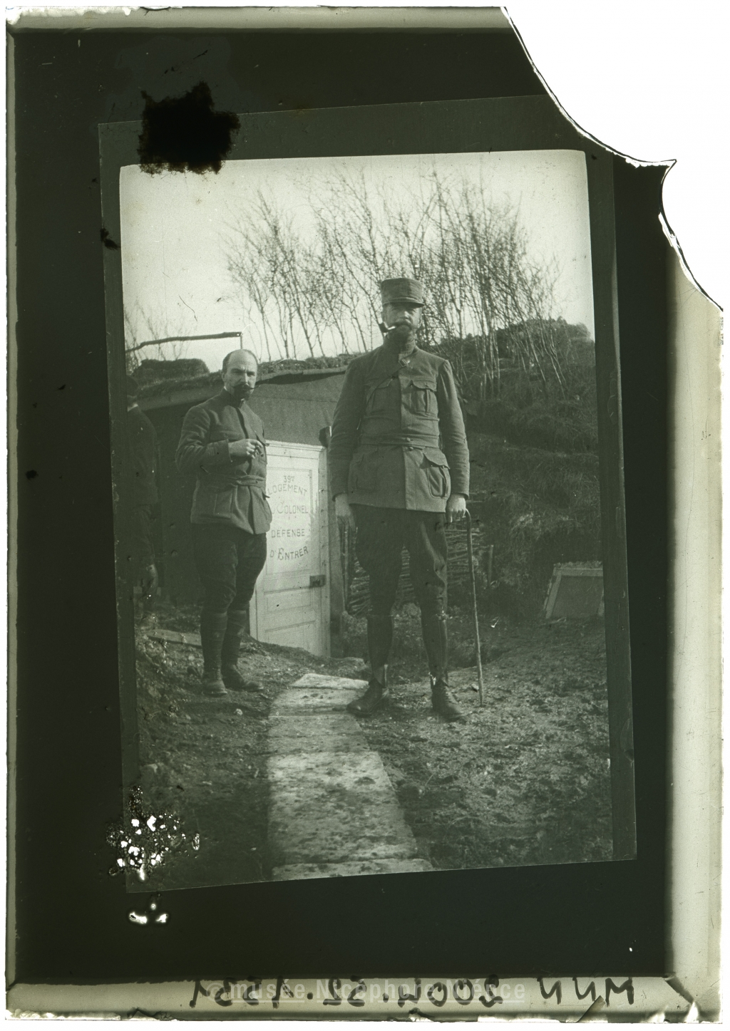 Deux militaires devant le logement du colonel (positif obtenu par contact avec un négatif souple réalisé au front par Bob Demachy)