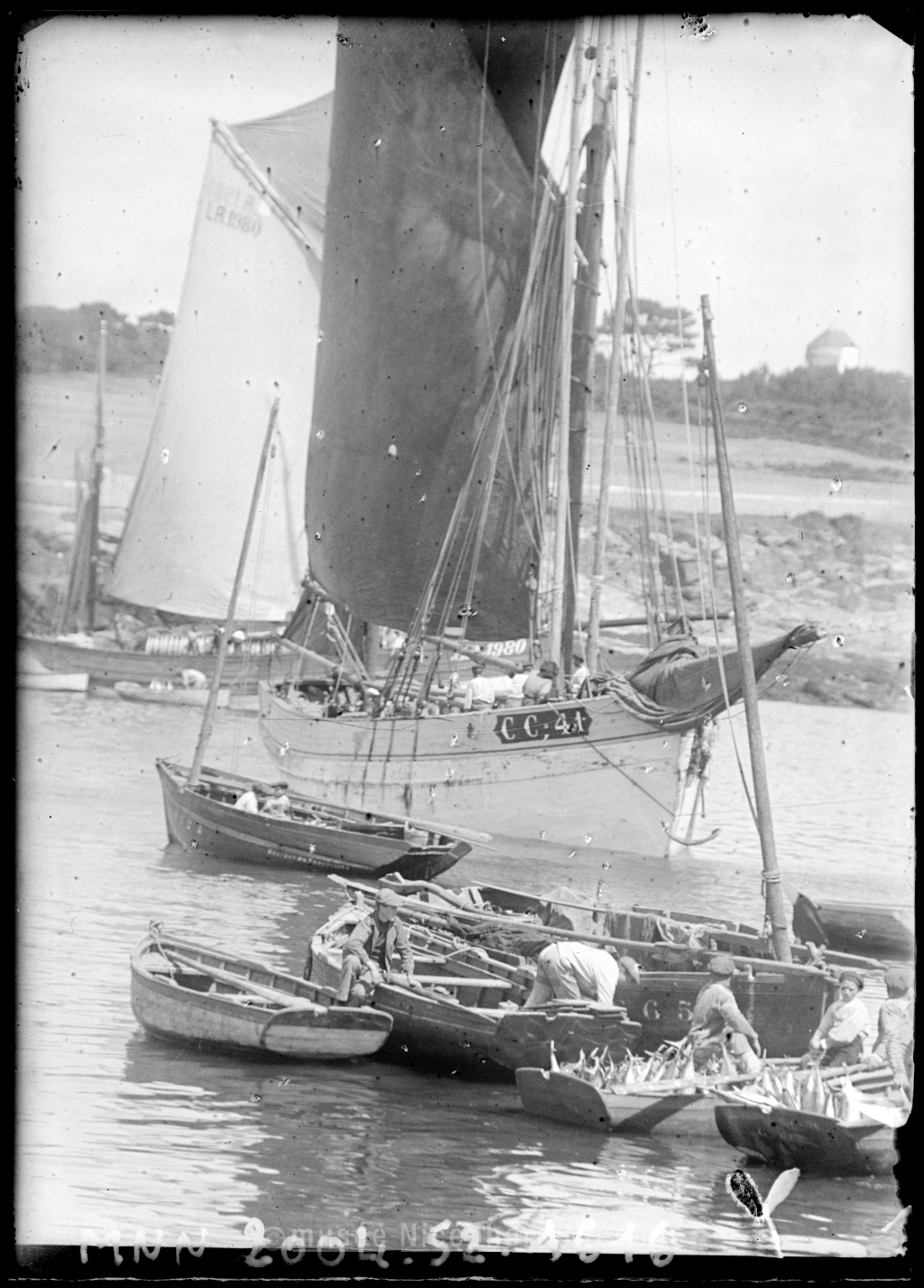 Pêcheurs sur leurs embarcations à Concarneau (?)
