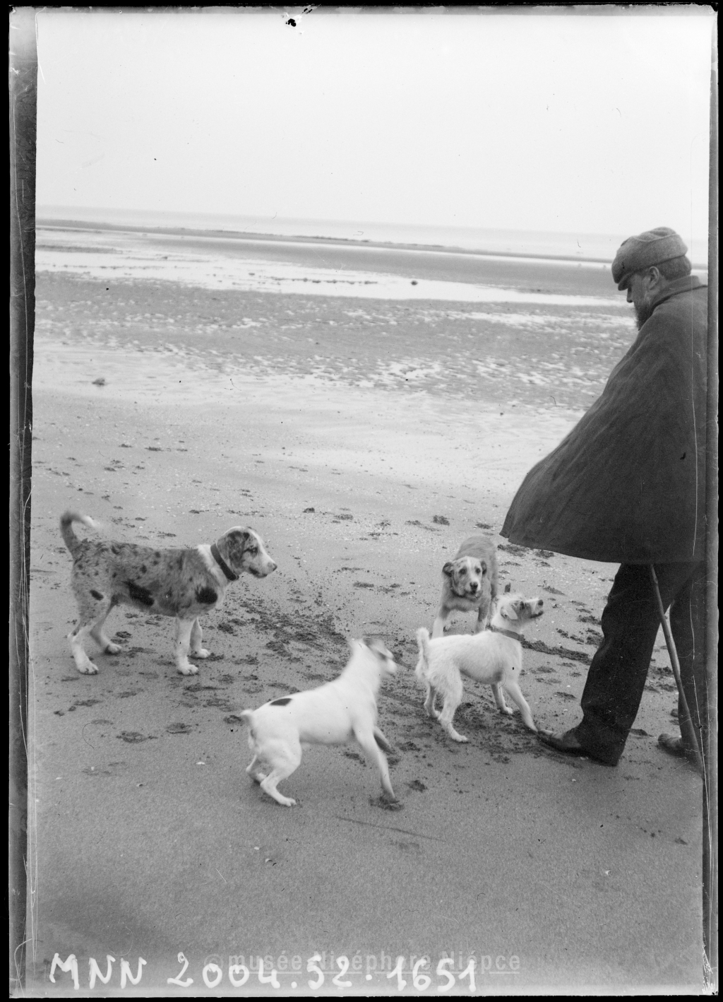 Homme (Robert DEMACHY ?) promenant des chiens sur la plage de Villers (?)