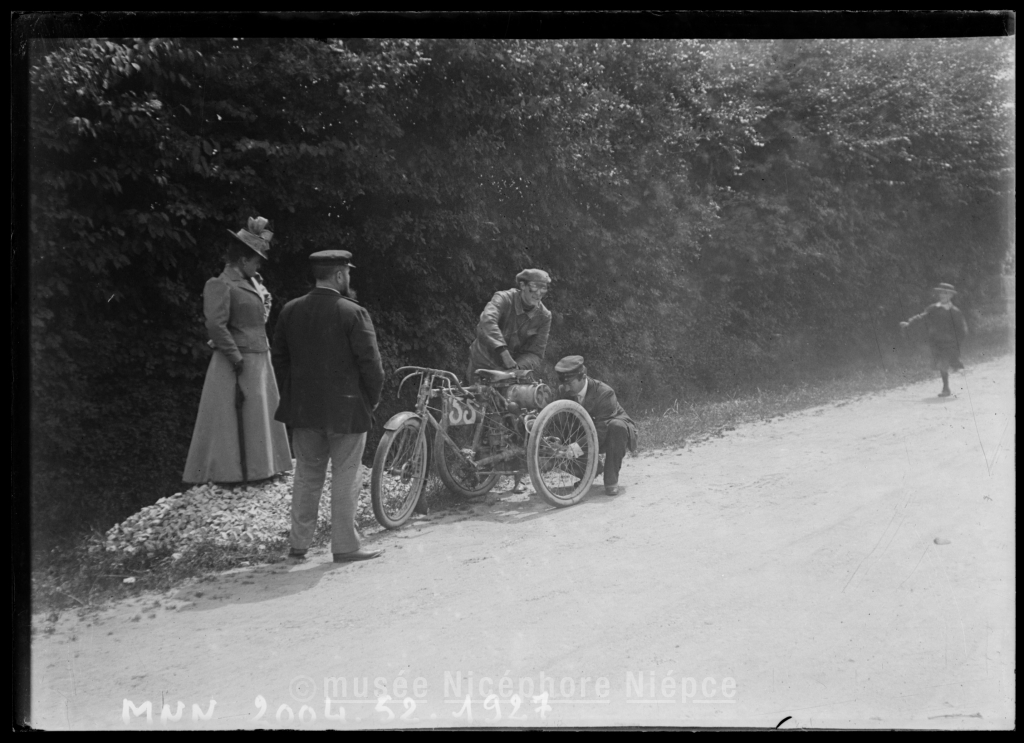Vélomoteur (?) le long dune route à loccasion dune course