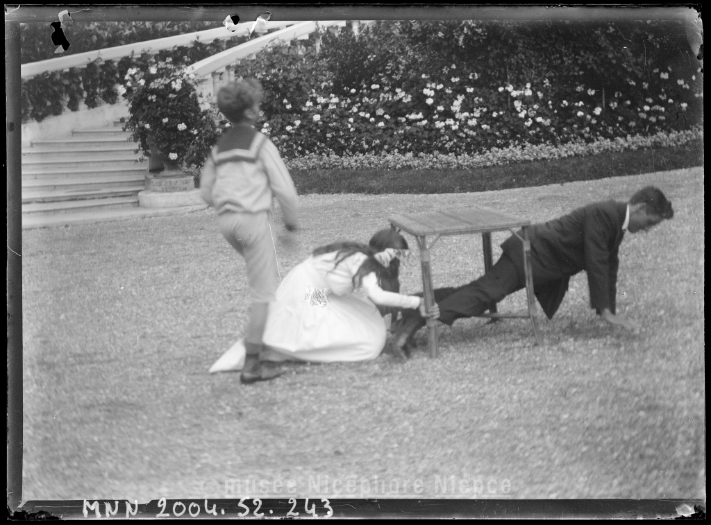 Trois jeunes gens (Bob de dos ?) jouant dans le jardin du château