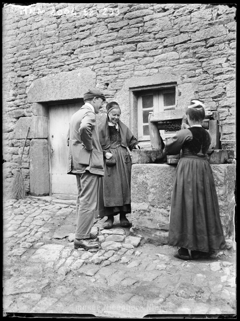 Homme et deux bretonnes autour d'un puits