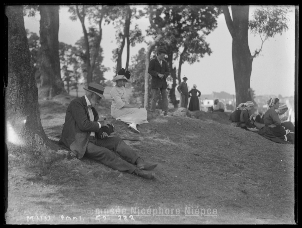 Robert DEMACHY tenant un appareil photographique près dun groupe de dentellières aux Plomarch