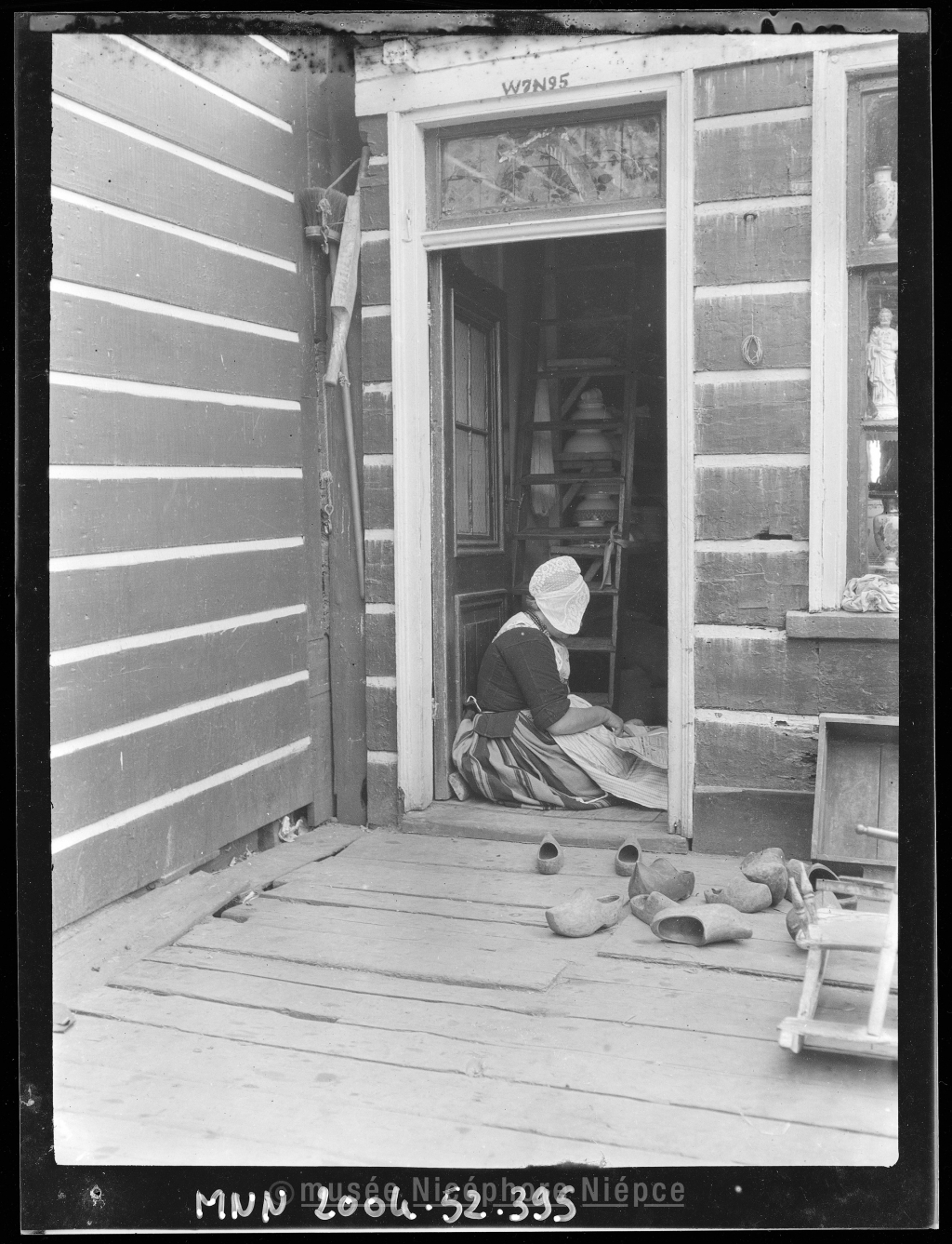 Femme assise devant l'entrée d'une maison