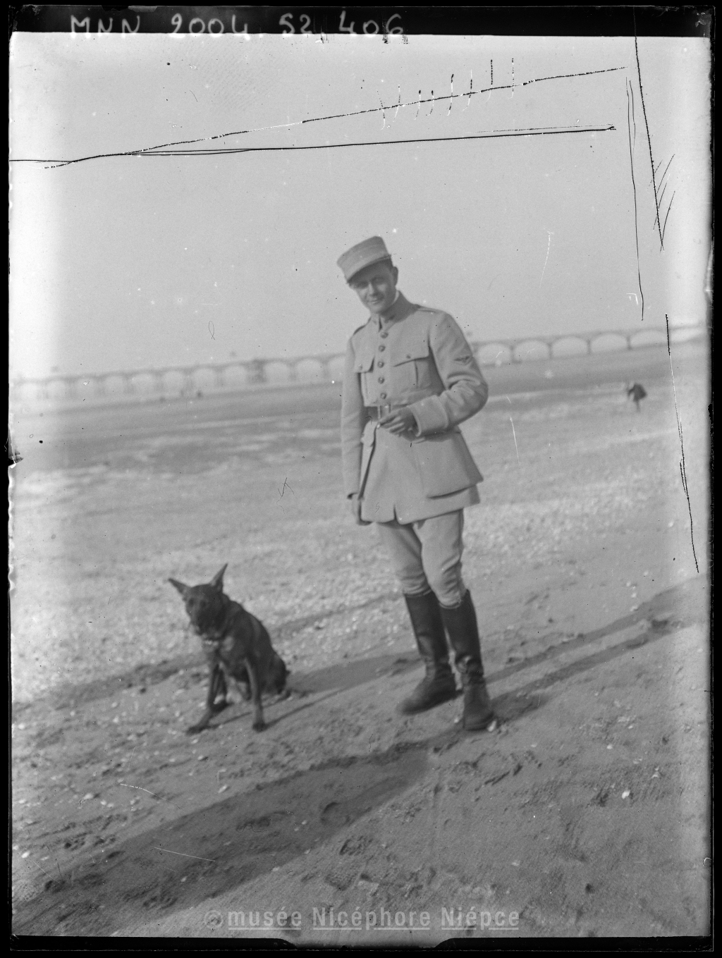 Militaire, accompagné dun chien, posant sur la plage de Trouville