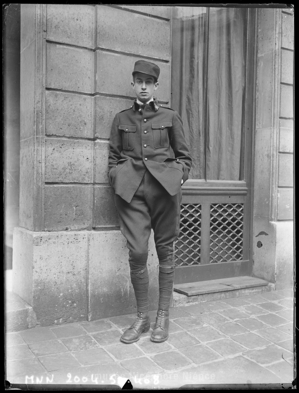 Jeune homme en tenue militaire posant dans la cour d'un immeuble