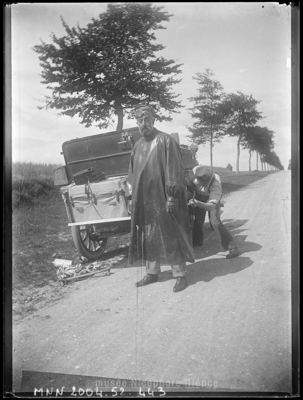 Portrait de Robert DEMACHY devant sa voiture pendant une réparation