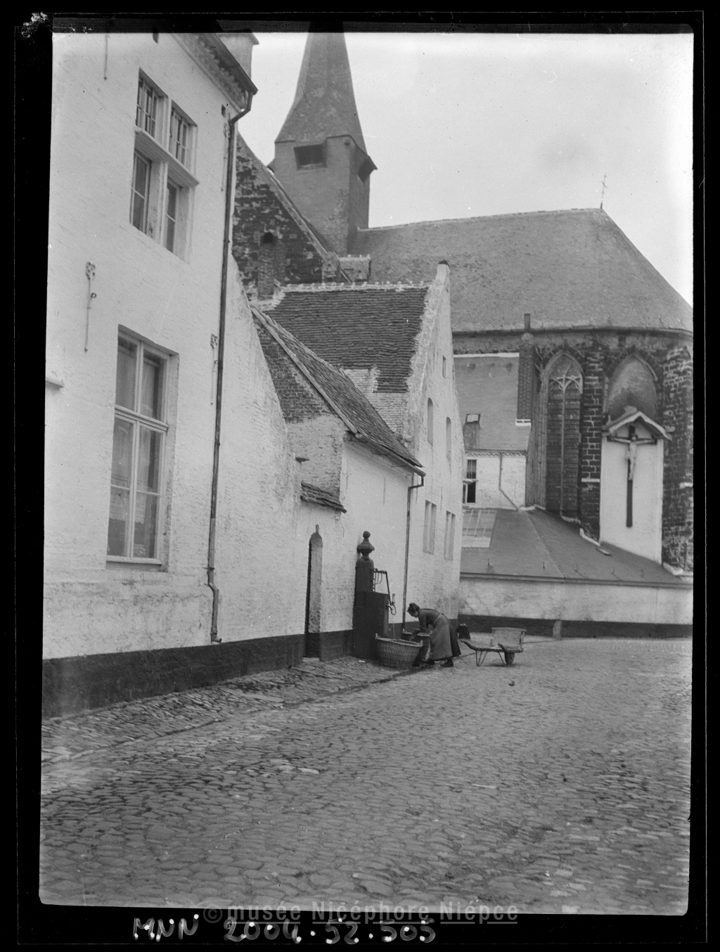 Femme puisant de l'eau à une fontaine à proximité d'une église