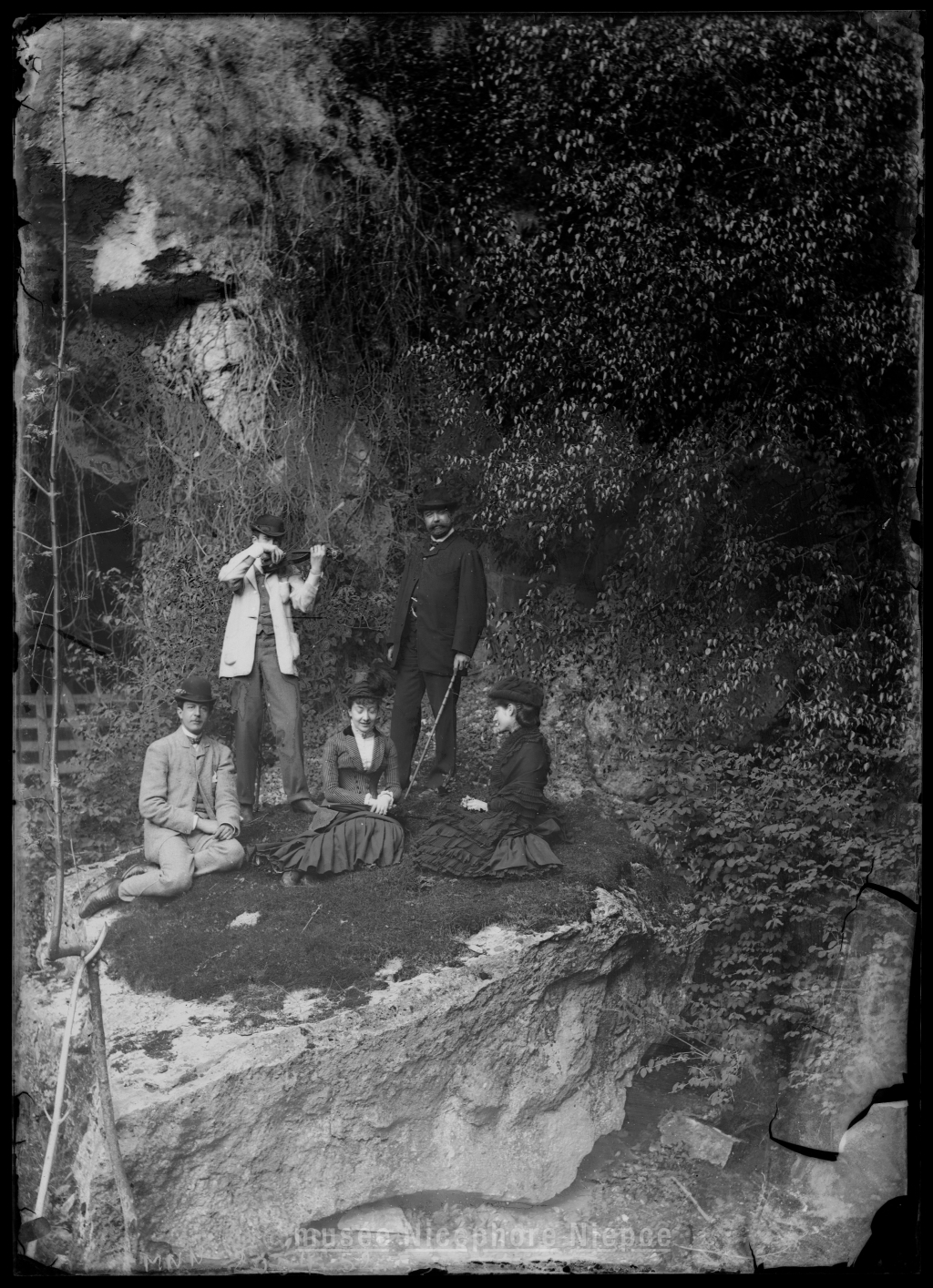 Cinq personnes, dont un violoniste, sur un rocher