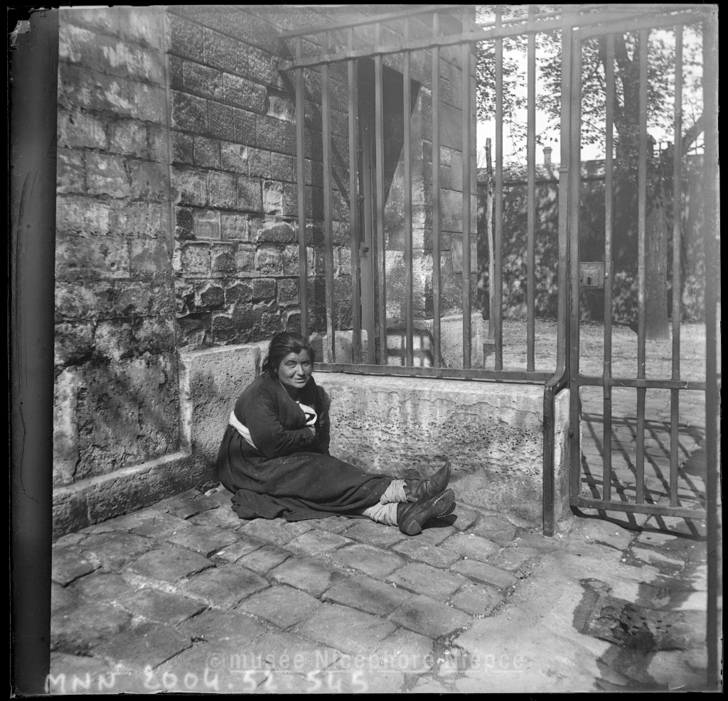 Patiente assise devant des grilles dans la cour de l'hôpital