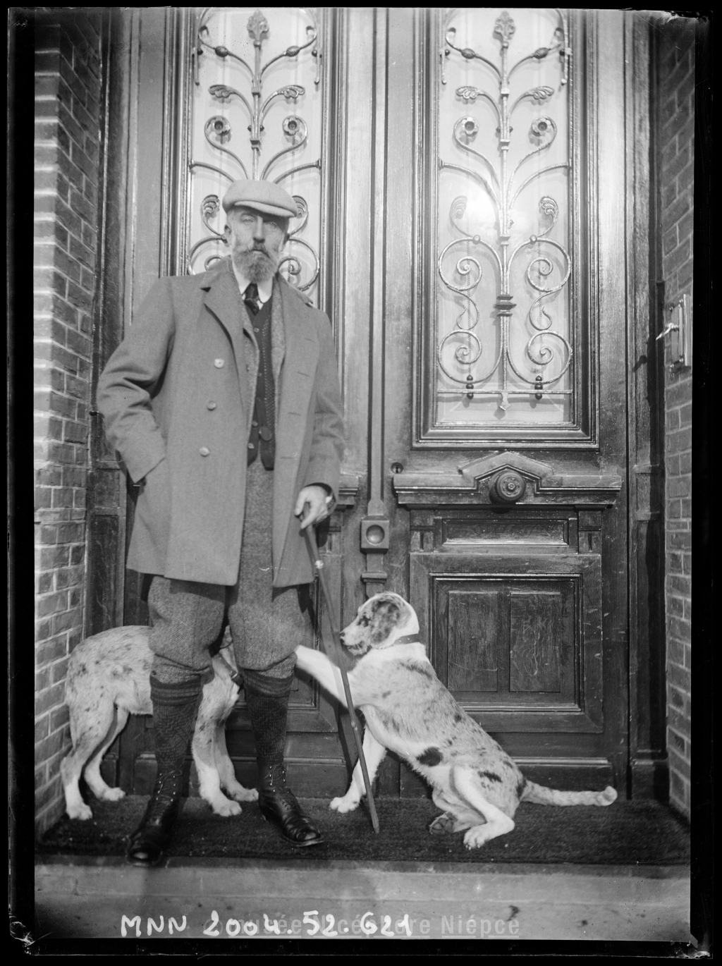 Robert DEMACHY et ses chiens devant la porte dentrée du château