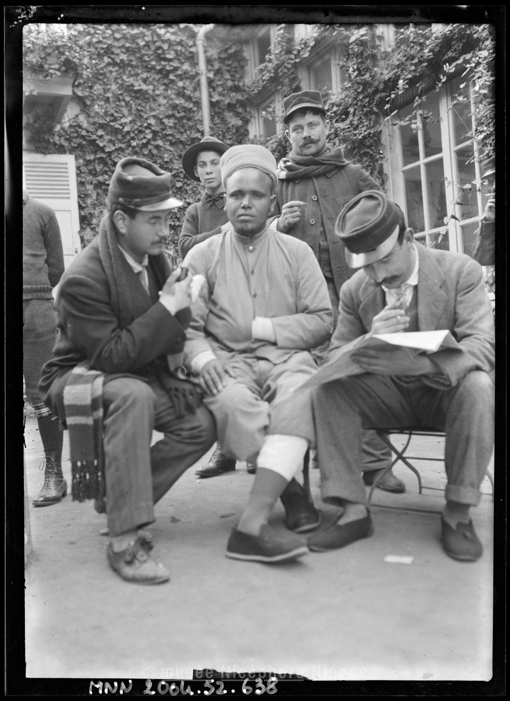 Soldats blessés dans la cour du dispensaire