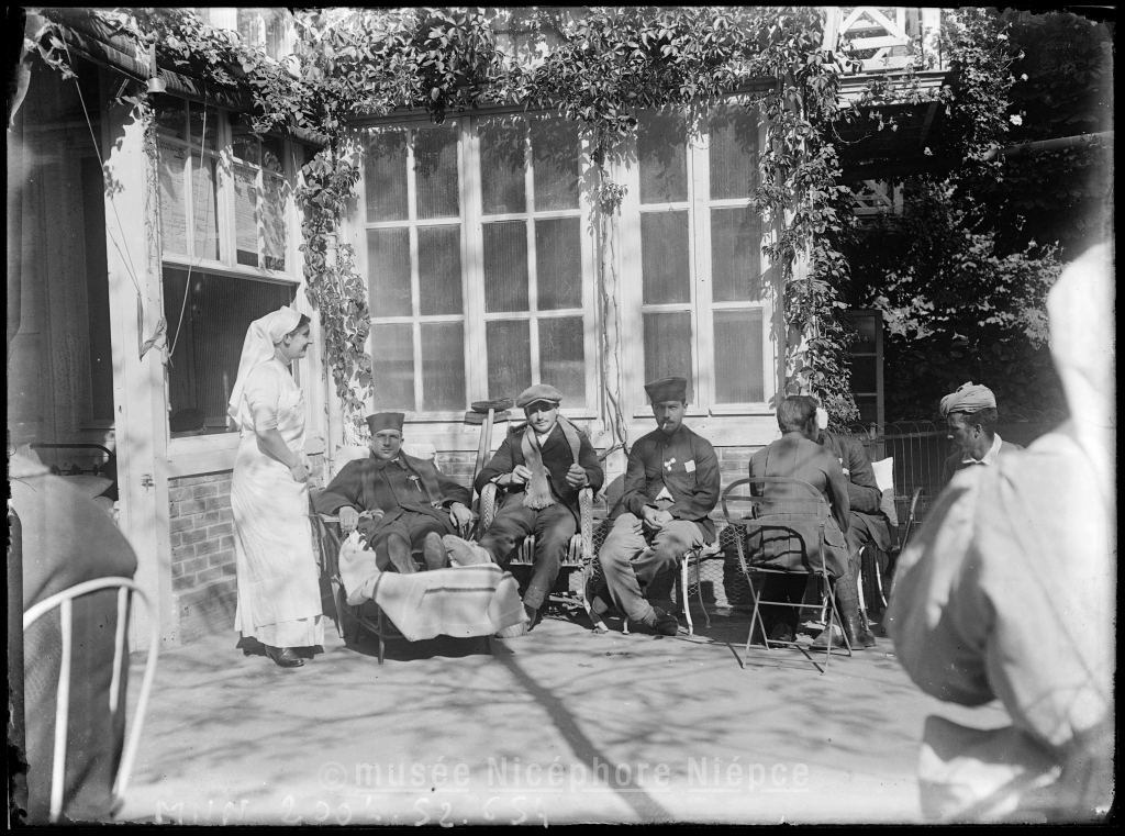 Infirmières et blessés dans la cour du dispensaire