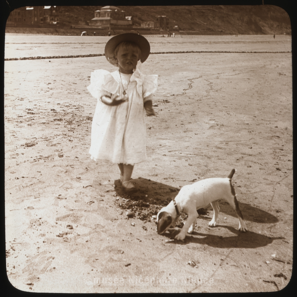 Enfant (Jack ?) jouant avec un chien sur la plage de Villers (?)