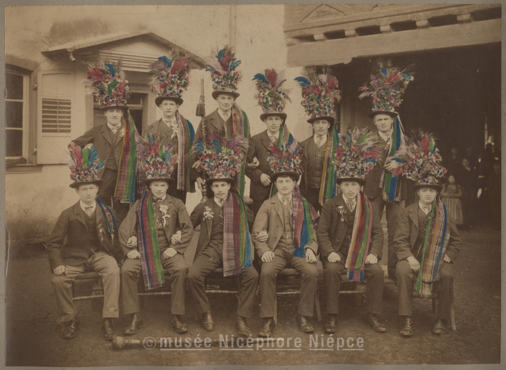 de fantaisie - chapeau - en pose - groupe de figures - jeune homme - écharpe - conscrit - Alsacien - cocarde image rehaussée de couleurs - chapeaux et écharpes - Emile LORSON