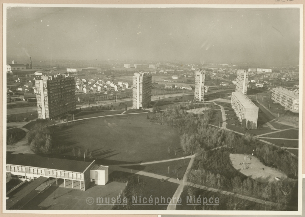 Du haut de l'immeuble-tour de l'Aubépin vue panoramique sur le nouveau Chalon, au nord de la ville 21 Novembre 1961