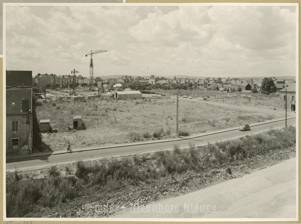 Sur l'emplacement de l'ancienne Verrerie-Aupècle début des constructions d'immeubles, et notamment de la tour de la Verrerie : Vue prise depuis l'immeuble des Ponts-et-Chaussées, avec au premier plan, la rue de la Verrerie et, dans l'angle, l'axe Nord-Sud 3 Août 1964