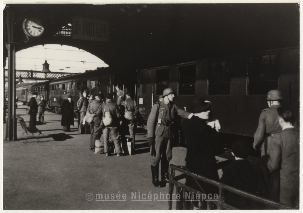 Le contrôle des voyageurs en gare. Quai de gare à Chalon-sur-Saône pendant l'occupation.