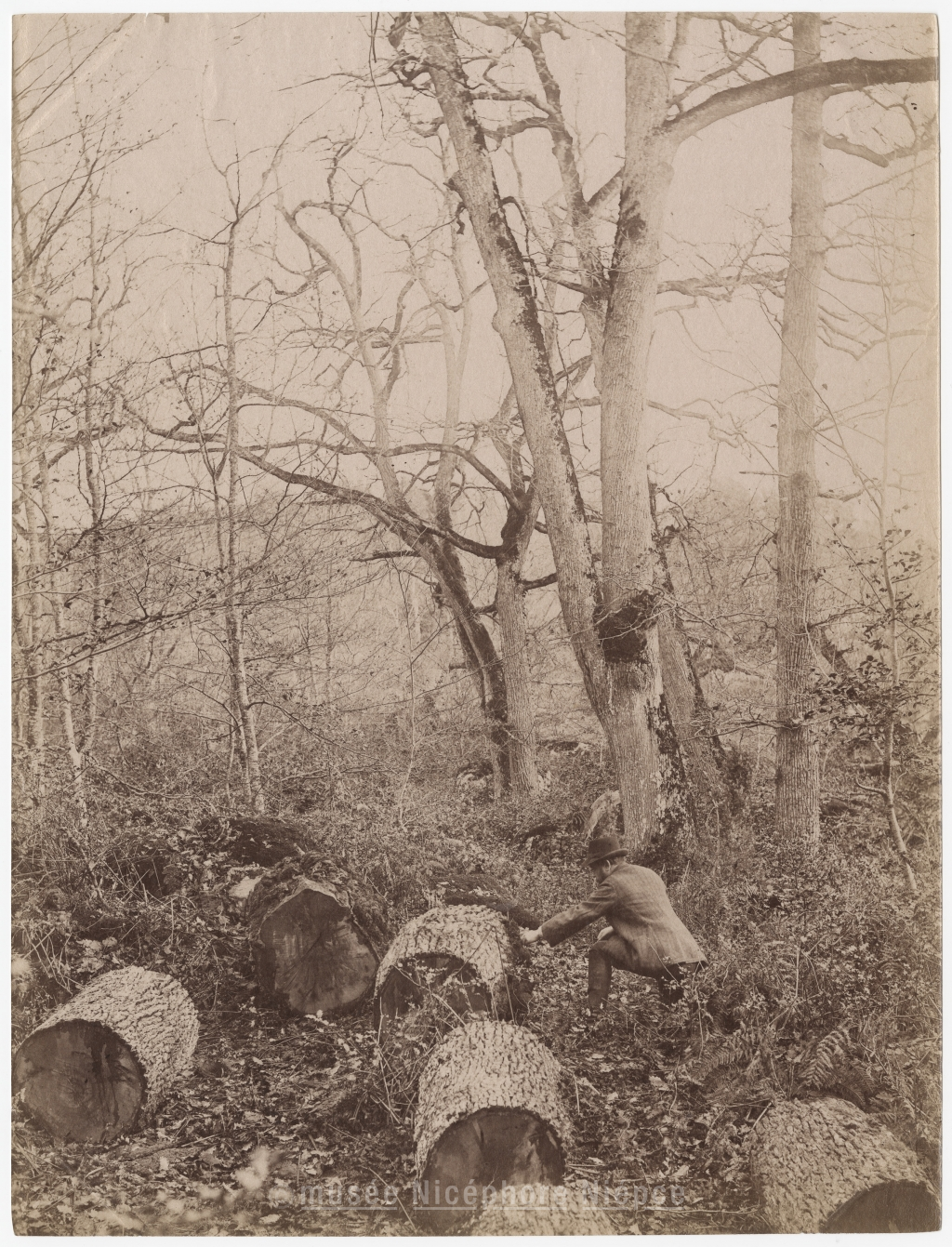 Personnage examinant un tronc d'arbre