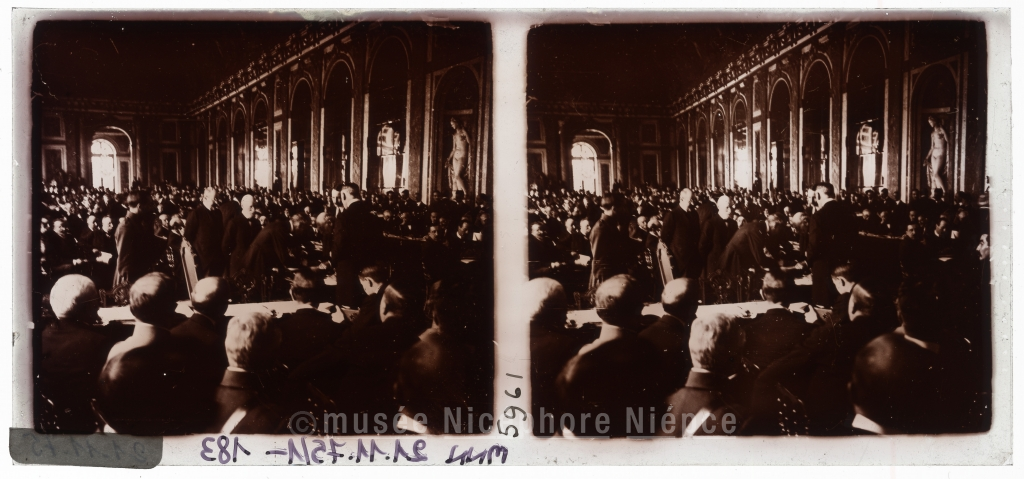 VERSAILLES - LA GALERIE DES GLACES / LA SIGNATURE DE LA PAIX / La table de la signature - Les trois délégués belges MM. Hymans, / Van den Houvel et Vandervelde signent le Traité de Paix.
