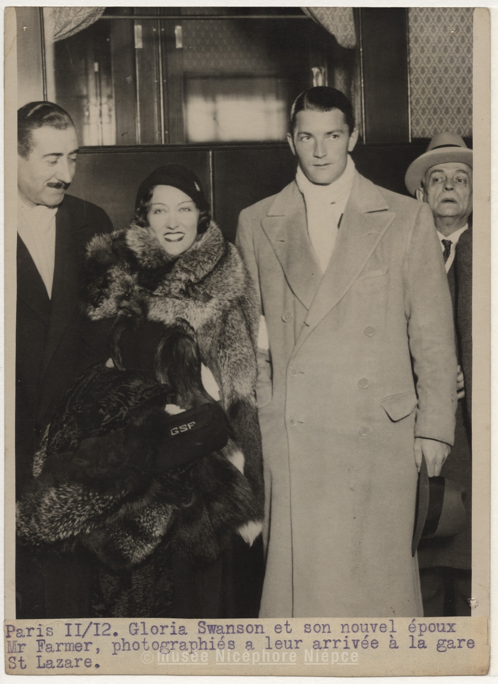 Paris 11 décembre 1931. Gloria Swanson et / son nouvel époux Mr Farmer, photographiés à / leur arrivée à la gare St-Lazare