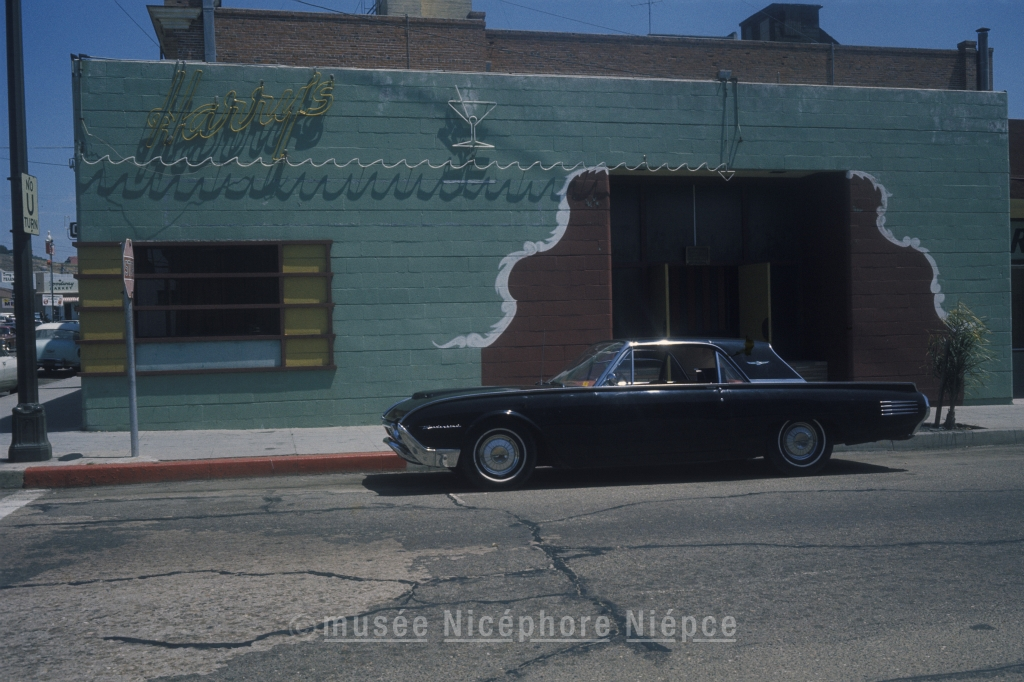 Automobile américaine garée devant un débit de boisson