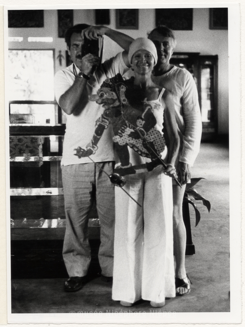 Portrait du photographe, d'un homme et d'une femme dans un miroir avec une marionnette Indonésienne