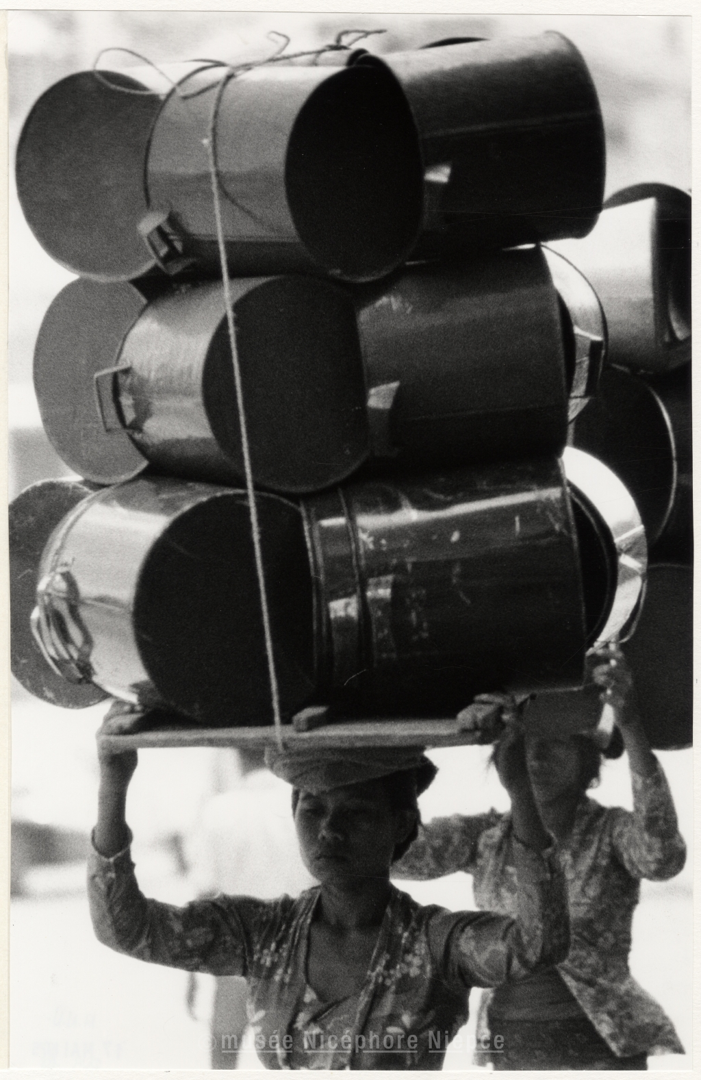 Femmes asiatiques portant sur la tête un impressionnant chargement de bidons
