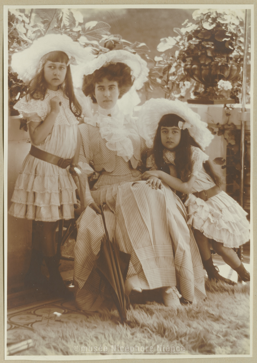 Hélène Demachy, Baronne de Seillière et ses deux filles, Frédérique et Nicole, sur la terrasse du château