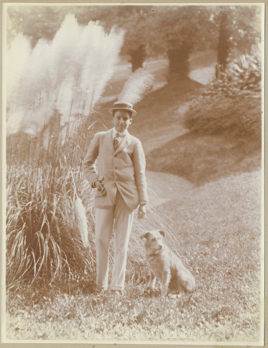 Bob Demachy posant dans le jardin du château de San Carlo avec un chien