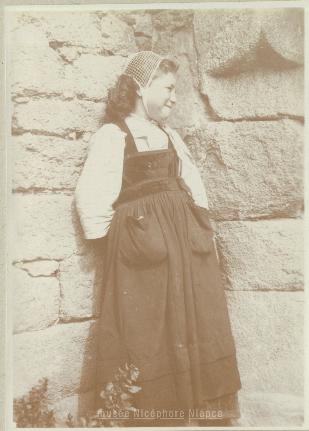en pied - portrait - costume traditionnel - en pose - fillette - de profil - sourire - adossé - Breton - pictorialisme - Robert DEMACHY
