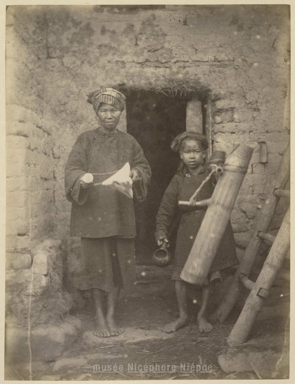 Montagnards chinois sur la frontière sino-annamite / femme dévidant du fil de coton - enfant / portant de l'eau dans un bambou